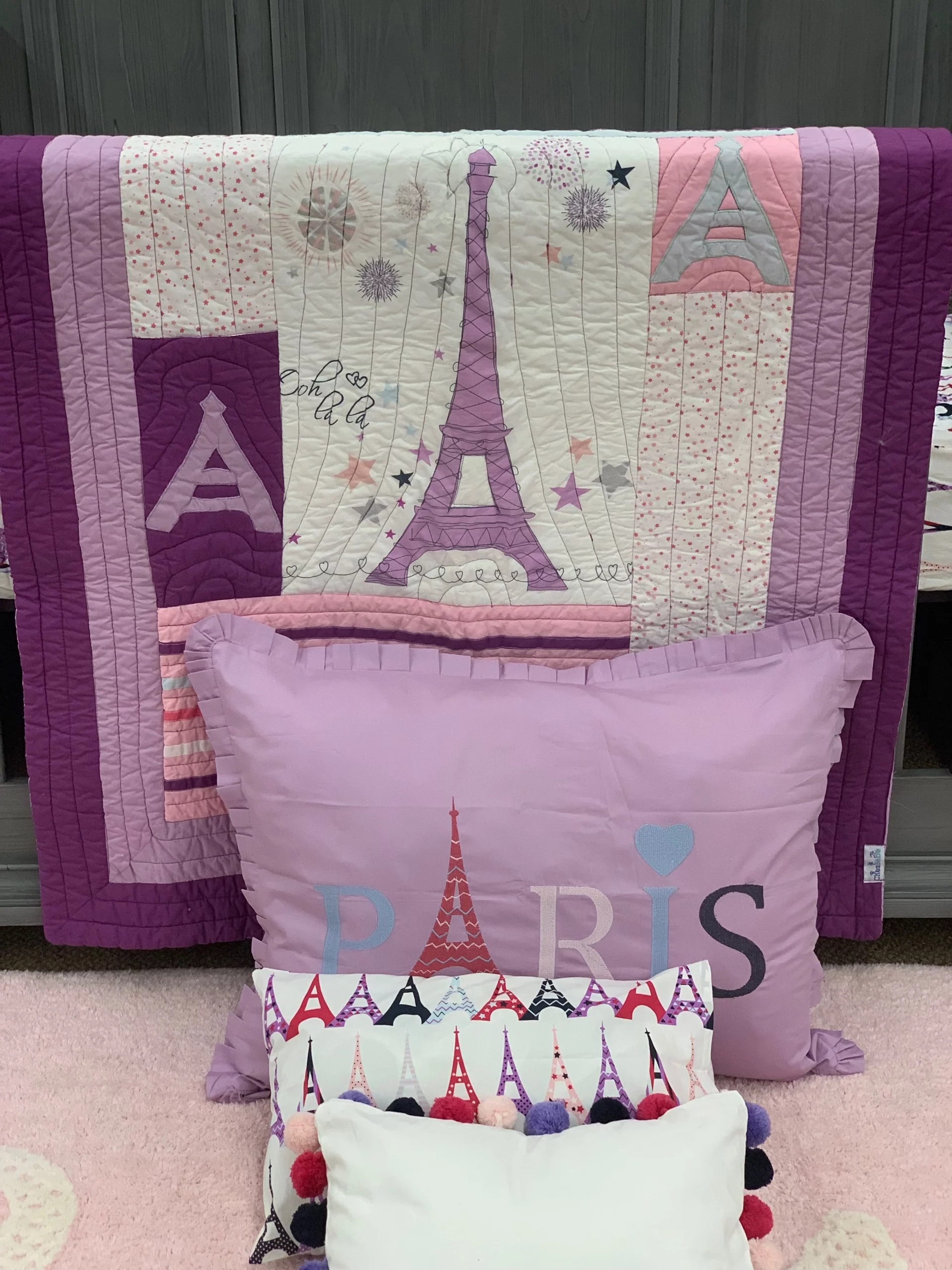 Paris letters embroidered on solid purple background with ruffle accent trim