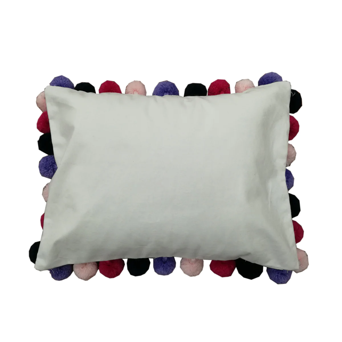 Overview Solid White Pillowcover embellished with multicolor pom poms  exclusively for Chez Bébé. Details 100% cotton canvas Multicolor pom pom accents Spot Clean Designed in USA, Made in China Dimensions Breakfast Pillow Cover 12 x 16